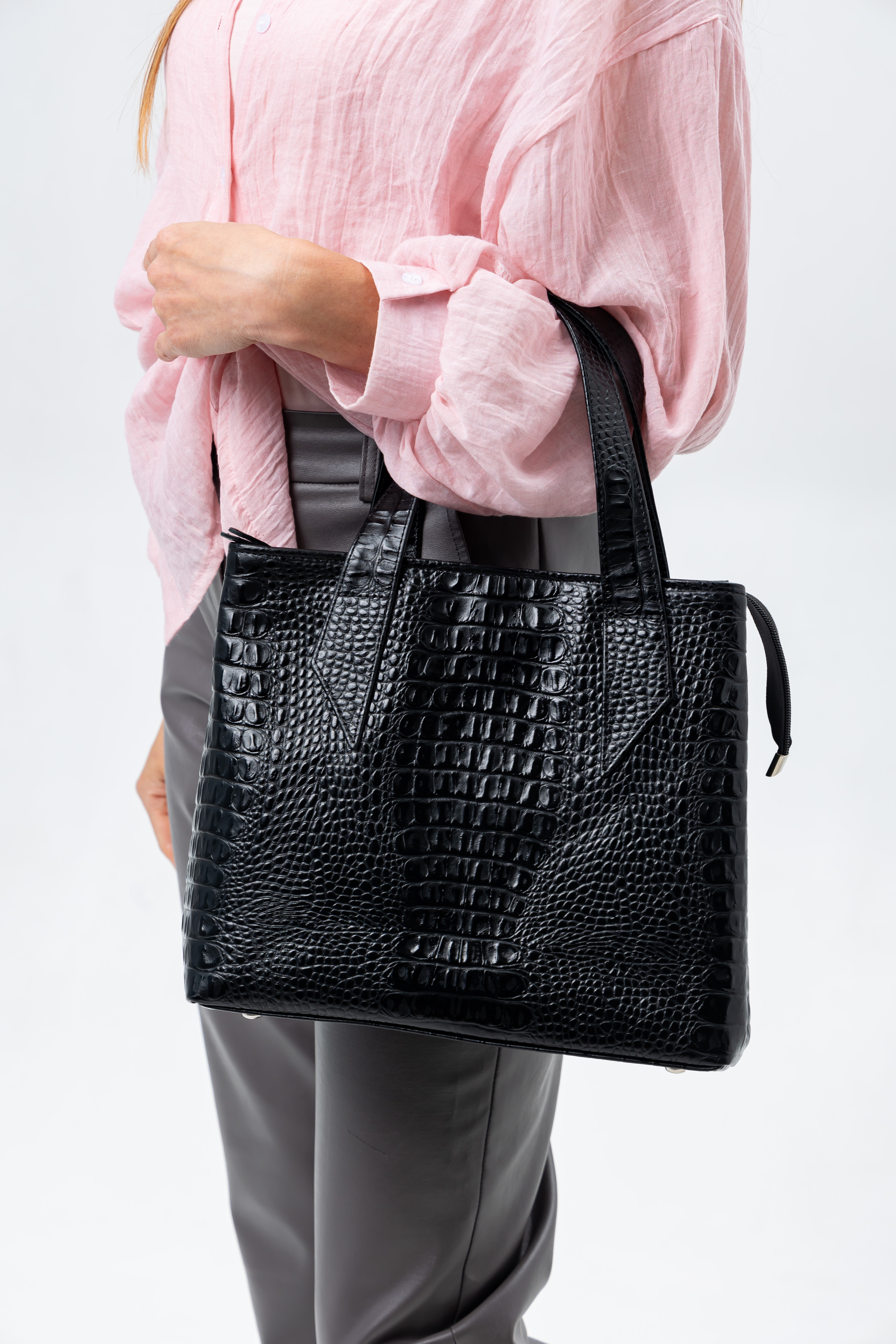 Эта шопер-сумка выполнена из высококачественной натуральной черной кожи кайман (под крокодила), что придает ей изысканный винтажный вид. Вместительная большая идеально подходит для документов формата А4 и легко вмещает ноутбук. С дизайном, шоппер оснащен двумя удобными ручками для ношения через и на плечо или на руку, что создает её универсальной для любых ситуаций — городские прогулки и посещение колледжа или работы.